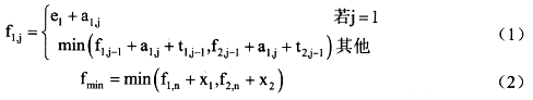 分析该问题,发现问题具有最优子结构。以L1为例,除了第一个工位之外,经过第j个工位的最短时间包含了经过L1的第j-1个工位的最短时间或者经过L2的第j-1个工位的最短时间,如式(1)。装配后到结束的最短时间包含离开L1的最短时间或者离开L2的最短时间如式(2)。